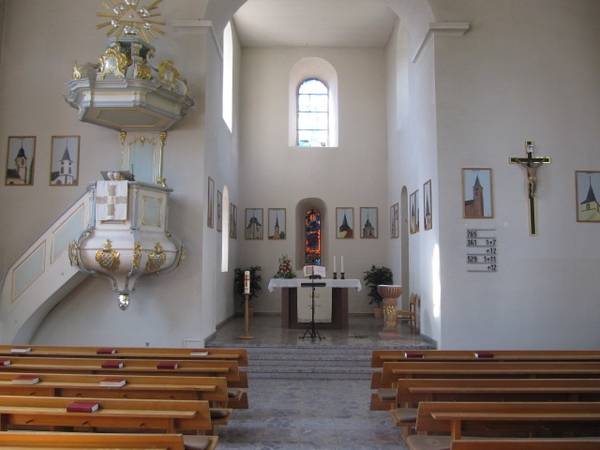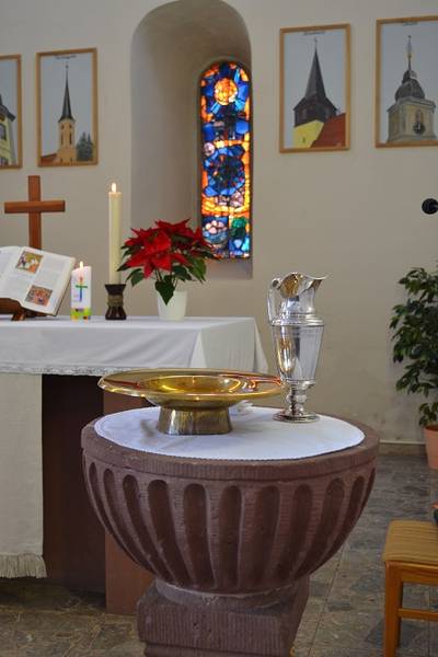 Der Taufstein ist aus dem Vorgängerbau erhalten geblieben. Er trägt als Innschrift die Angabe des Steinmetz (Auctor Philipp Schmelz) und gibt als Entstehungszeit 1753 an. Auffallend an ihm ist das kunstvolle "Träubeles"-Ornament.
